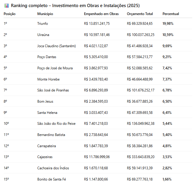 Por outro lado, alguns municípios apresentaram níveis mais baixos de investimento em infraestrutura. Carrapateira empenhou 4,81%, Cajazeiras ficou com 3,53%, Cachoeira dos Índios com 2,82%, enquanto Bonito de Santa Fé aparece na última colocação, com apenas 1,66% do orçamento destinado a Obras e Instalações em 2025.